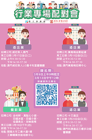 報名期由即日(本月九日)上午九時起至本月十三日中午十二時。市民可登入政府手機應用程式「一戶通」進入「求職服務」頁面,點選「行業專場配對會」(https://www.dsal.gov.mo/jobseeking/app),選擇欲參加之場次及應徵崗位;報名獲接納後將以手機短訊通知。勞工局和工聯亦會主動以短訊通知符合條件的求職者。名額有限,欲報從速。