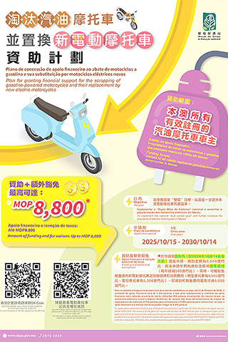 上述兩項資助計劃是配合國家實現「雙碳」目標的重要舉措,亦是特區政府本年度施政方針的重點工作。《淘汰汽油摩托車並置換新電動摩托車資助計劃》申請期由2025年10月15日至2030年10月14日,為期五年。資助對象範圍擴大至所有在澳門特別行政區具備有效註冊的重型或輕型汽油電單車車主,但不包括在2025年10月6日或之後已被取銷註冊且其後重新註冊的電單車車主,以及結欠澳門特別行政區債務的電單車車主。倘於申請期首年內(即2026年10月14日或之前)提出申請,資助金額為3,500澳門元,其後申請年期的資助金額將逐年遞減。同時可獲豁免擬置換的新電動電單車之試驗號牌和註冊費用,即資助和豁免費用最高可達8,800澳門元。