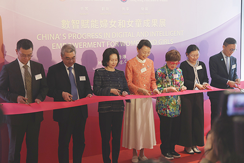 ◎ 三月十六日,香港各界婦女聯合協進會與中國婦女兒童博物館聯合舉辦的「數智賦能婦女和女童成果展」在上環信德中心舉行開幕典禮。此次展覽旨在呈現利用數字科技賦能女性發展的卓越成果。圖為全國婦聯副主席林怡(中)、香港婦協主席何超瓊(左三)等嘉賓舉行剪綵儀式。(香港中通社記者 鄧梓傑 攝)