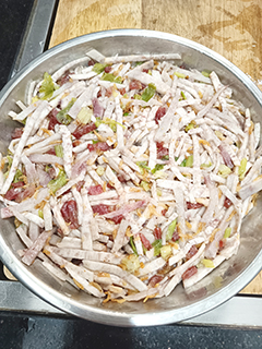 首先把芋頭切成長幼條,放盆中用少許鹽水,醃十五分鐘上下變柔軟;切臘腸粒與蝦米炒香,放入芋頭絲內,再放少許澱粉、五香粉,帶膠手套攪拌所有材料。
