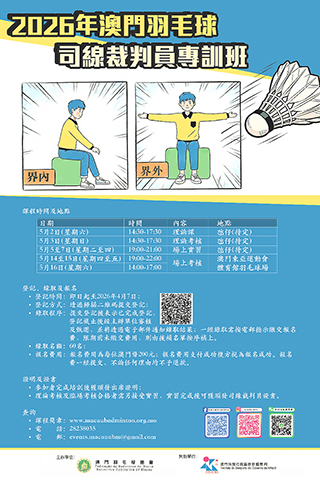 【特訊】為配合澳門羽毛球運動的蓬勃發展,進一步提升本地裁判的專業水平,並為培訓更多具備國際視野的裁判人才,澳門羽毛球總會將於2026年5月舉辦「澳門羽毛球裁判員培訓班(司線裁判員專訓班)」。活動由澳門體育局贊助,現正公開招募學員,誠邀廣大市民及有志於投身裁判工作的羽毛球愛好者踴躍報名,共同為澳門羽毛球事業貢獻力量。