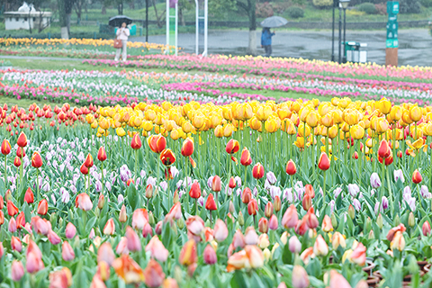 ◎ 三月十七日,湖北武漢,漢口解放公園裡的郁金香競相綻放。遊客雨中賞花,別有一番風味。(中新社記者張暢 攝)