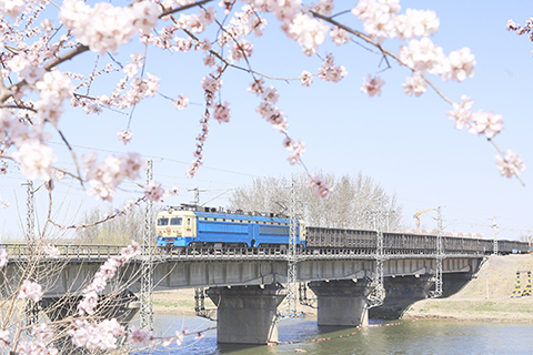 ◎ 三月十八日,北京,一列藍黃塗裝的貨運電力機車牽引著重載車廂,穿行於京承鐵路春日花海與碧水之間。(中新社記者 賈天勇 攝)