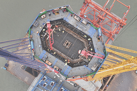 ◎ 三月十九日,安徽銅陵,高二百八十二點七米的池州長江公鐵大橋三號北主塔完成封頂,標誌著池州長江公鐵大橋雙主塔全部封頂,大橋建設全面轉入主跨鋼樑架設及斜拉索安裝階段。該大橋連接安徽省池州市貴池區和銅陵市樅陽縣,全長三點一公里,其中主橋長一千七百六十八米,為主跨八百一十二米的三主桁三索面雙層鋼桁樑斜拉橋。圖為北主塔封頂施工現場。(無人機照片)(中新社記者韓蘇原 攝)
