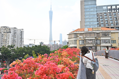 三月十九日,廣州市海珠區,綻放的簕杜鵑吸引行人拍照,遠方是廣州電視塔(俗稱「小蠻腰」)。◇(中新社記者 陳楚紅 攝)