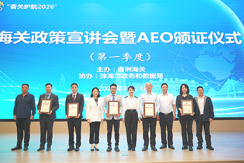 【記者陳藝珠海報道】3月24日下午,拱北海關所屬香洲海關舉辦首季度政策宣講會暨AEO企業頒證儀式,為珠海小米通訊技術有限公司、廣東金灣高景太陽能科技有限公司等5家新獲批的AEO企業集中頒證。自此,珠海市AEO企業總數增至75家。