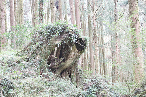 在阿里山的巨木群中,千百年來被砍伐後遺留下的檜木樹根,依然牢牢護住這片土地,形狀各異、各具美態,令人讚嘆大自然的鬼斧神工。根據當地人的介紹,阿里山的千年紅檜樹心部位常可見空洞,因為樹皮內的韌皮部和形成層能上下輸送水分和營養,使千年老樹得以保持生機,展現舊貌新顏。