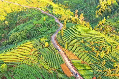 ◎ 三月三十一日,在四川省雅安市名山區紅星鎮長崗山茶園,層叠茶壟如大地指紋舒展,美不勝收。(中新社記者 安源 攝)