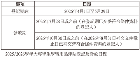 更多詳情,可瀏覽「大專學生學習用品津貼」專頁(https://appl.dsedj.gov.mo/LMSSubsidy/)。◇