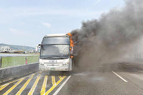 台灣第一號高速公路客運失火 2026-04-06 03:30:00 ◎ 四月五日台灣第一號高速公路苗栗路段發生客運火燒車事故,一輛客運行經駛南向一百三十四點五公里苗栗路段,司機突然聽見車內傳出異常聲音,立刻將車輛停靠路肩,並緊急疏散車上九名乘客,該車隨即起火並冒出濃煙。這起事故一度造成雙向車流回堵,警方獲報到場一度封閉中外線車道,目前火勢已撲滅車流也逐漸紓解,全案起火原因由警方調查中。(香港中通社圖片)