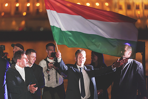 匈牙利蒂薩黨國會選舉中獲勝 2026-04-14 03:30:00 ◎ 四月十二日,在匈牙利首都布達佩斯,匈牙利蒂薩黨領導人毛焦爾.彼得(中)在勝選晚會上揮舞匈牙利國旗。匈牙利國家選舉辦公室四月十二日晚公佈的初步計票結果顯示,由毛焦爾.彼得領導的蒂薩黨在當天舉行的國會選舉中獲勝。匈牙利總理歐爾班當晚承認敗選。此次選舉結果意味著歐爾班自二0一0年起連續十六年的執政生涯將結束。(新華社發 鮑洛格.達維德 攝)