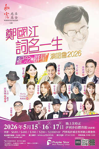 著名填詞人鄭國江(鄭老師)䇄立香港樂壇55年,撰寫的廣東歌歌詞超過2千多首,為表揚鄭老師在樂壇的貢獻,將於5月15日至17日(星期五、六、日)假灣仔伊利沙伯體育館表演場,舉行作品展《鄭國江詞名一生紀念群星演唱會2026》。參與演出歌手多達15位,包括5月15日演出:區瑞強、林子祥、葉振棠、周國豐、李思捷、李紫昕、Vincie;5月16日演出:區瑞強、鍾鎮濤、肥媽Maria Cordero、黎瑞恩、曾路得、李紫昕、Vincie,以及5月17日演出:區瑞強、譚詠麟、陳美齡、林志美、露雲娜、李紫昕,昨日(4月14日)鄭老師與區瑞強、肥媽及鄭子誠出席記者招待會交代詳情。