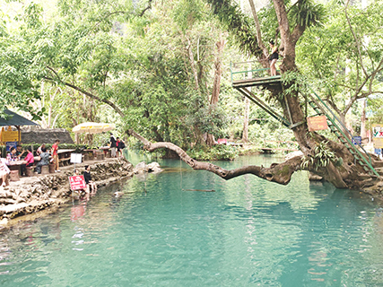 萬榮的坦普坎藍瀉湖,更是這片秘境裏的一顆明珠。這方喀斯特地貌孕育了一泓澄潭,湖水因礦物質浸染,呈現出絕美的藍綠色。陽光灑落,湖面波光粼粼,湖水澄澈見底,游魚在石縫間自在閑遊。四周翠峰環抱,草木蔥蘢,幽靜得宛若世外桃源。臨湖佇立,清風撫面而來,柳影輕飄,偶爾傳來「噗通」一聲,水花四濺,那是冒險者從高台躍入湖中,為這片寧靜的境地添了幾分生動的活力。