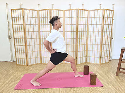 然後雙手上舉,以此帶動著整個背部伸展;胸腔繼續向上伸展,後大腿也要持續向外旋,從而建立堅實有力的基礎。注意在後腿伸展的過程中,同樣要關注腿的伸展和延長,後腿的膝蓋後方要打開,左腳屈曲時膝蓋不大於九十度。