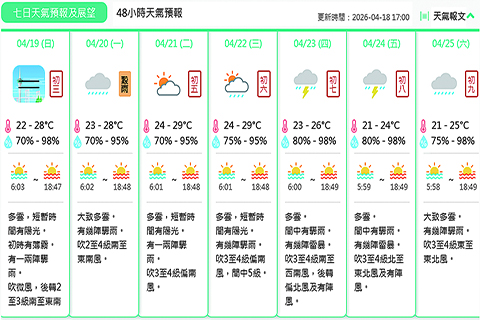 預測今日多雲,短暫時間有陽光。初時有薄霧。有一兩陣驟雨。吹微風,後轉二至三級南至東南風。氣溫約為攝氏廿二至廿八度。相對濕度介乎百分之七十至九十八之間。預測最高紫外線指數約為七,級別屬於高。◇