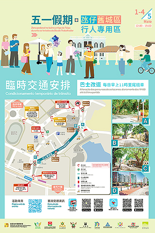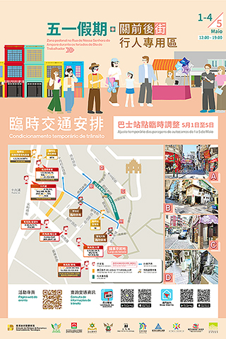 【特訊】為營造舒適安全的假日出行環境,特區政府將於五月一日至四日期間,每日中午十二時至晚上七時,在氹仔舊城區及關前後街設置「五一假期行人專用區」,由經濟及科技發展局、市政署、旅遊局、治安警察局、消防局、文化局及交通事務局聯同社團商會合作協調落實。