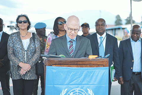 ◎ 聯合國剛果(金)穩定特派團(聯剛穩定團)團長詹姆斯.斯旺四月二十四日在剛果(金)東部的北基伍省首府戈馬表示,各方應為剛果(金)停火監督機制有效運行創造必要條件。圖為當日,聯合國剛果(金)穩定特派團(聯剛穩定團)團長詹姆斯.斯旺(前中)抵達剛果(金)北基伍省首府戈馬後對媒體講話。(新華社發)