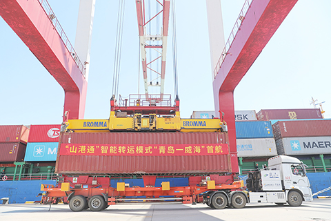 ◎ 四月廿四日,「山港龍口」輪靠泊在山東港口青島港前灣港區進行裝載作業。當日,首批一百卅三個進口外貿集裝箱在山東港口青島港前灣港區完成吊裝作業,隨後經支線船舶「山港龍口」輪轉運至威海港,標誌著「山港通」智能轉運進口模式正式開通。該模式與此前已開通的出口模式實現雙向貫通,進一步增強了山東港口群的協同發展能力。「山港通」智能轉運模式由青島海關創新推出,通過「樞紐港+支線港」的組合運營機制,實現貨物在港口間的智能調撥運輸,貨物可「一次申報、一次查驗、一次放行」,有效簡化通關流程,降低運營成本。(新華社發 張進剛 攝)