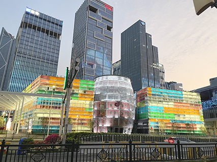 站在這里向西望去,獵德大橋、珠江新城的摩天群樓、小蠻腰(廣州塔)與海心沙等地標盡收眼底;向東則是另一片商業競逐之地,騰訊、阿里、小米等高新企業的辦公大樓在夜間以燈光表演點綴城市天際,將琶醍的時尚氣息融入蓬勃的江水文化與夜經濟中。外露的鋼架結構、炫目的燈光設計與工業風廣場,縱橫交錯的綠地花木,一同構成溫情又浪漫的開放空間。