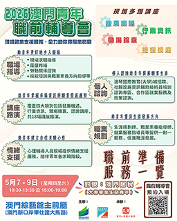 【特訊】為協助澳門青年順利開展職業生涯及投入就業巿場,由教育及青年發展局和勞工事務局主辦,並由澳門工會聯合總會承辦的「澳門青年就業配對會」(下稱配對會)及「澳門青年職前輔導會」(下稱職輔會)將於5月7日至9日一連三日於澳門綜藝館舉行。配對會及職輔會兩項活動由即日起可於網上預約及報名。