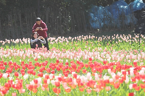 ◎ 二月二十日,兩名遊客在郁金香花海中…