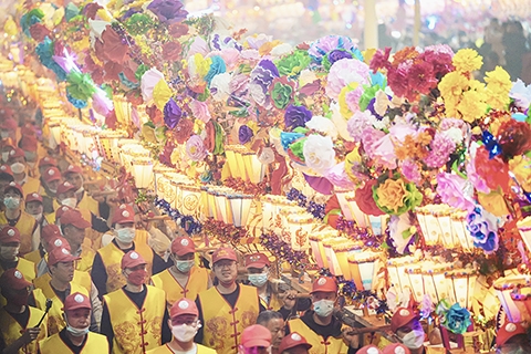 ◎ 二月十九日,農曆大年初三,市民遊客在山西高平釜山村賞花燈。釜山村為高平第四屆炎帝燈會的核心會場之一,因四周群山環繞、中部較低、地形似「釜」,故得名釜山。(中新社記者 楊郁然 攝)