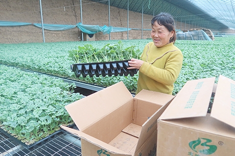 ◎ 三月十七日,在河南三門峽靈寶市一家農業公司的日光溫室育苗區,農戶搶抓農時培育蔬菜、瓜果秧苗,有序開展春播春種各項農事作業。圖為農戶將幼苗裝箱。(中新社發 孫猛攝)