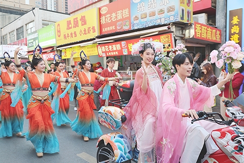 ◎ 四月七日,山東淄博,表演隊伍在八大局便民市場沿街巡遊,為夜間燒烤預熱。(中新社記者趙曉 攝)