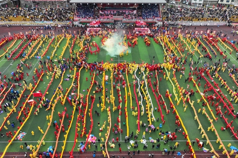 ◎ 二月廿七日,航拍「仡佬毛龍節」現場。當日,貴州省銅仁市石阡縣「仡佬毛龍節」在該縣體育場舉行,當地各村寨及參加展演的八十條「仡佬毛龍」齊舞賀新春。「仡佬毛龍」是石阡仡佬族世代流傳下來的新春主要慶祝活動之一,期間,石阡各村寨村民就會自發組織編扎毛龍,鬧新春,送吉祥。(無人機照片)(中新社記者瞿宏倫…