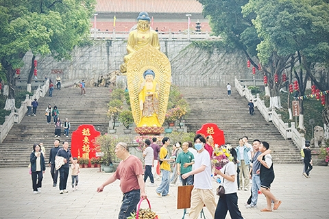 ◎ 四月五日,清明節。廣東順德不少市民帶同祭品及鮮果等祭品拜祭先人。圖為民眾前往寶林寺掃墓。(香港中通社記者 徐文攝)