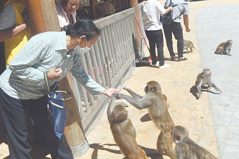 遊客在廣西巴臘屯巴臘猴山景區喂猴子