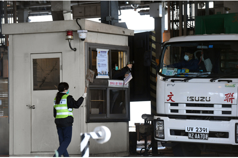 口岸衛生署執勤職員都佩戴口罩及醫用橡膠手套。職員用閃燈交通棒截停貨車後,用紅外線體溫測試儀檢測司機體溫,並收取由司機本人填寫的醫學監察表格及健康申報表,留做紀錄後放行。