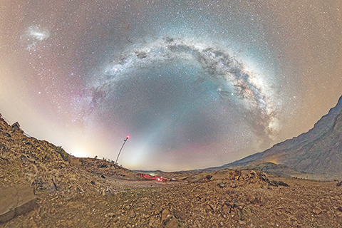 在這幅廣角主題影像裡,我們銀河系的中央盤面如拱弧懸在頂端,而左緣可見到我們銀河系的伴星系─大麥倫哲星系(LMC)。這張影像整合了三十多幀,去年七月在智利山區拉塞勒那市近郊連續拍攝的照片。在接下來的二個月之間,日落後在北半球的天空中可見到明顯的黃道光。