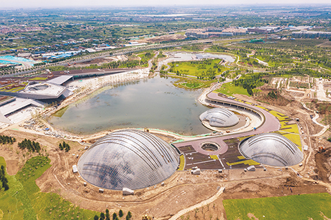 ◎ 八月二十一日,山西太原,航拍即將建成完工的太原植物園。太原植物園總面積約二千七百三十畝,目前全部工程已完成百分之九十五,預計在今年國慶節開門迎客。主展館的三個溫室植物館將展出一千一百多種植物,未來植物園將收集八千種至一萬種植物。(中新社記者武俊傑 攝)