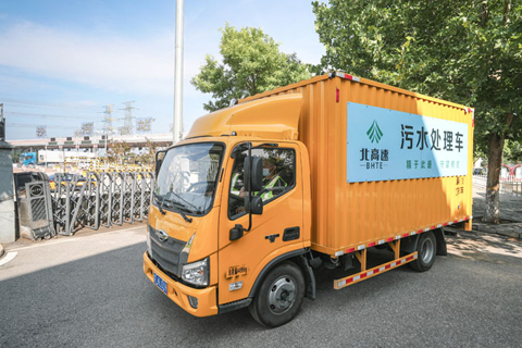 ◎ 七月二十三日,北京市高速公路交通工程有限公司研發的污水處理車駛入京新高速沙河收費管理所,準備作業。該車搭載集成式污泥脫水機系統,可將污泥快速脫水,實現污泥由液態轉化成固態,便於運輸和消納。自六月起,該型污水處理車已投用於北京市各高速公路收費管理所和服務區的污水處理站。(中新社記者賈天勇攝)