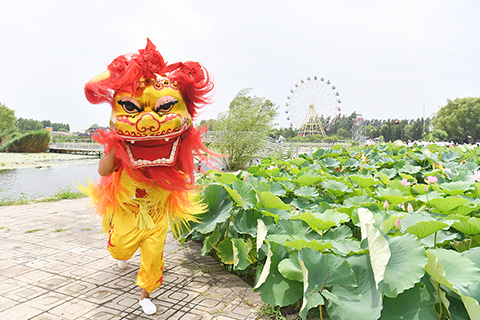 ◎ 六月二十八日,河北雄安新區白洋淀文化苑第六屆荷花節開幕。圖為文化苑裡的舞獅民俗表演。(中新社記者 韓冰 攝)