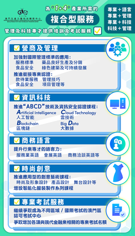 複合型人才是多功能的,多才多藝,需在較多領域表現到卓越能力或技能,包括知識複合、能力複合、思維複合等多方面。為培訓相關人才,該中心在現行培訓範疇和基礎下,對應四大產業的發展需要,強化多元培訓,例如「專業+語言」、「專業+管理」、「專業+科技」、「科技+管理」,對於營商及管理,將推廣適用於大健康產業的食品安全管理、藥品良好生產指引(GMP)及良好分銷管理(GDP)等標準;適用於旅遊及會展業及現代金融業的可持續發展管理標準。