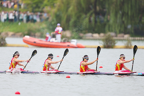 當日的比賽在杭州富陽水上運動中心舉行,「速度與激情」在綠水青山間上演。經過激烈角逐,中國隊共有5金入賬——林文君斬獲女子200米單人划艇冠軍;李冬崟摘得女子500米單人皮艇金牌;蔔廷凱/王叢康/張冬/董毅摘得男子500米四人皮艇冠軍;李冬崟/殷夢蝶/王楠/孫悅雯在女子500米四人皮艇項目中合力摘金;帥常文/林文君拿下女子200米雙人划艇項目金牌。