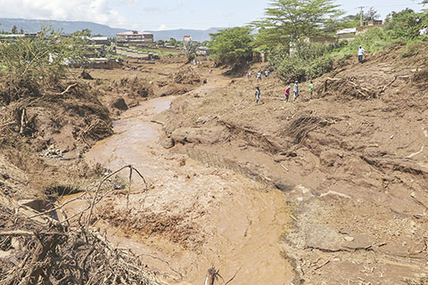肯尼亞一大壩決堤致42人死亡 2024-04-30 03:30:00 ◎ 肯尼亞警方4月29日說,受持續強降雨影響,肯尼亞多地發生洪災,首都內羅畢以北一處大壩當天決堤,致42人死亡。圖為當日在肯尼亞納庫魯一村莊拍攝的決堤引發的洪水。(新華社發 謝赫·馬伊納 攝)