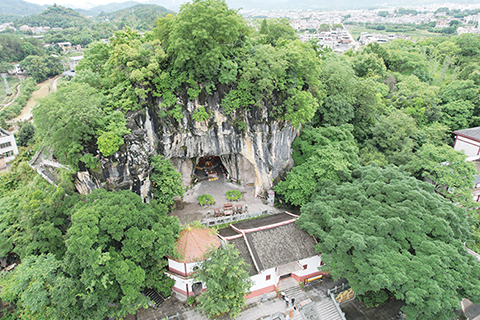 ◎ 五月廿一日,參觀者在均慶院遊覽。位於福建省武平縣岩前鎮的定光佛祖廟均慶院是海內外客家人的朝聖之地,定光佛信仰作為一種在「客家祖地」福建龍岩市發源並廣泛流傳于海峽兩岸客家人中的民間信仰,已在客家地區傳承了一千多年。圖為航拍均慶院一角。(無人機照片)(中新社記者 張斌 攝)
