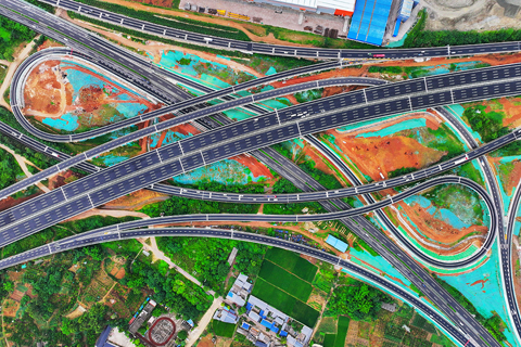 航拍天邛高速 2024-06-25 03:30:00 ◎ 六月二十四日,空中俯瞰青龍場樞紐互通。天邛高速位於成都市新津區及邛崍市,全長四十二點一二三公里,主線為雙向六車道,設計時速一百二十公里。項目建成後將新增一條連接天府新區的東西向快速通道,有效緩解成名高速、成雅高速的通行壓力。(無人機照片)(中新社記者 劉忠俊 攝)
