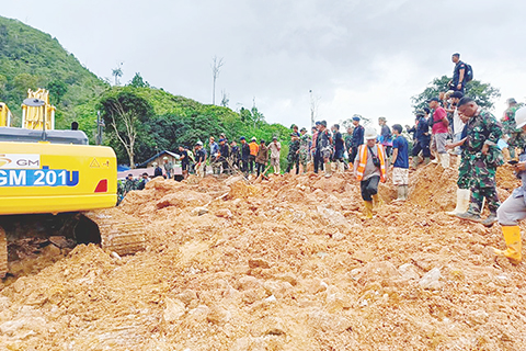 印尼哥倫打洛省金礦救援現場 2024-07-11 03:30:00 ◎ 印度尼西亞哥倫打洛省救災署官員7月8日說,該省波尼波朗戈縣一處金礦6日深夜遭遇山洪和山體滑坡災害,已致11人死亡、17人失蹤。圖為10日,救援人員在印度尼西亞哥倫打洛省波尼波朗戈縣遭遇山洪和山體滑坡的金礦附近開展搜尋工作。(新華社發 印尼哥倫打洛省搜索救援隊供圖)