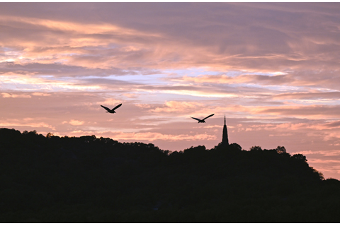 ◎ 八月二十一日,鳥兒從保俶塔前飛過。當日,浙江杭州西湖出現壯美晚霞,橙紅色的夕陽鋪滿雲端和湖面,美不勝收。(中新社)