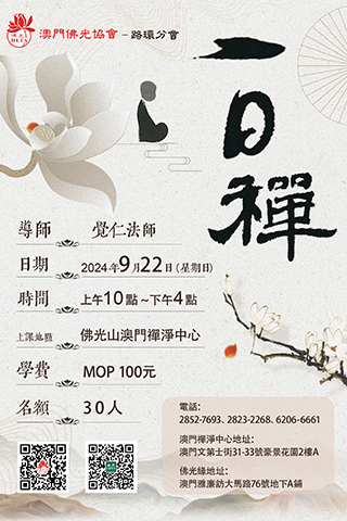 澳門佛光協會路環分會將於9月22日舉辦一日禪,讓忙碌的現代人找回禪心,回歸心靈的寧靜,進一步發掘內心的寶藏。