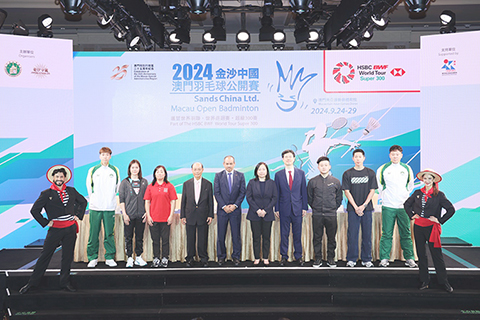 「2024金沙中國澳門羽毛球公開賽」周二在澳門倫敦人舉行記者招待會公佈比賽詳情,由澳門特別行政區政府體育局代副局長李詩靈、世界羽毛球聯會賽事營運總監Selvaamresh Supramaniam(中文翻譯:沙爾逢)、鄭君諾、鄺達財、器材贊助單位輝厲國際控股有限公司總經理張鴻洲,以及澳門羽毛球總會秘書長黃家瑛等一眾社會賢達出席。