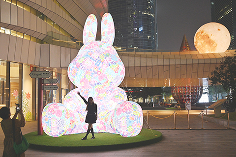 ◎ 九月十二日,廣州市天河區一商場的中秋主題裝置吸引遊客拍照。(中新社記者陳楚紅 攝)