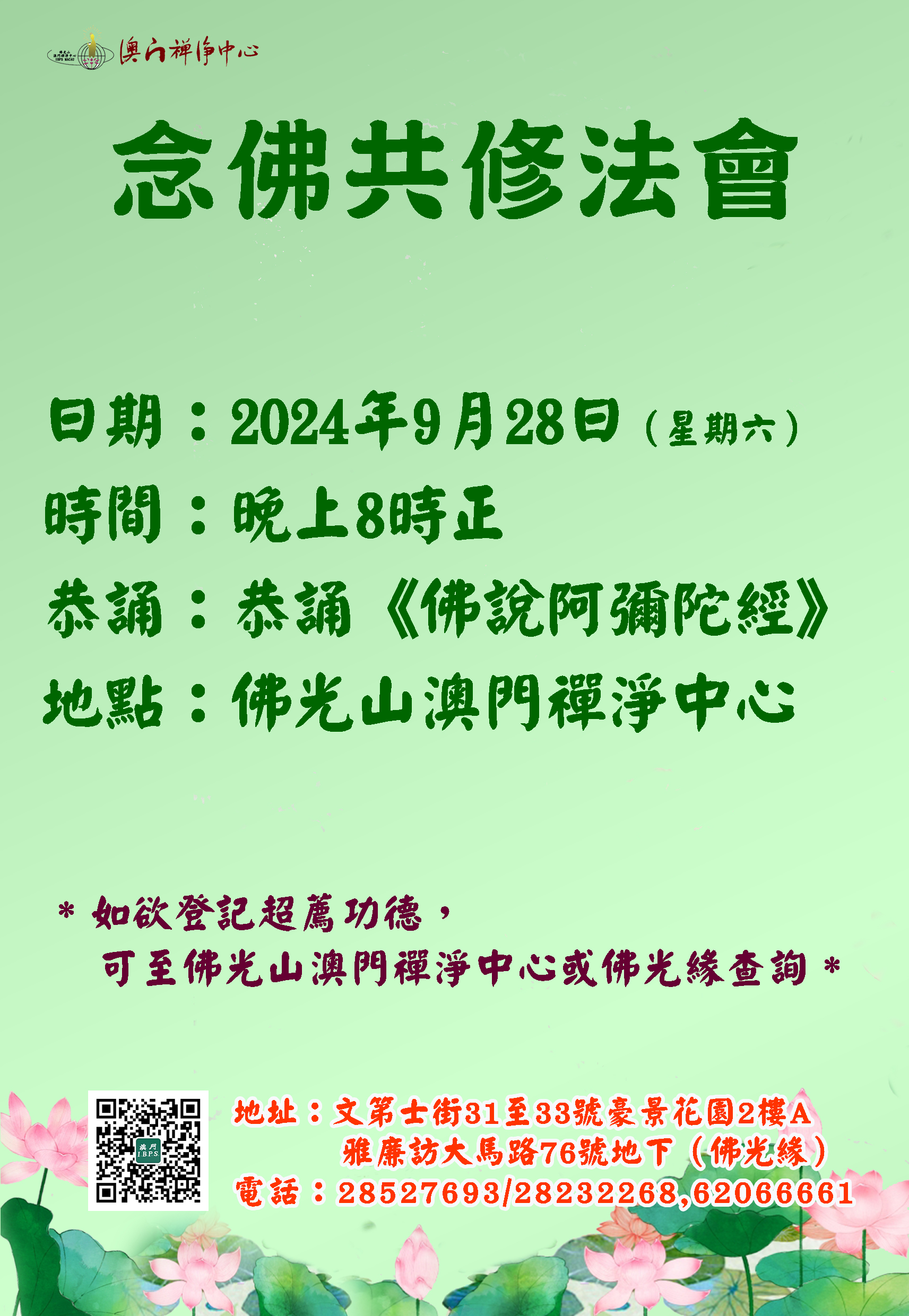 念佛共修法會 2024-09-25 03:30:00 佛光山澳門禪淨中心將於9月28日啟建念佛共修法會,法會期間設有隨堂超薦。 日期:2024年9月28日(星期六) 時間:晚上8時正 禮拜:恭誦《佛說阿彌陀經》 地點:佛光山澳門禪淨中心 ※法會設有隨堂超薦功德,冥陽兩利※ 查詢及登記功德: 佛光山澳門禪淨中心 地址:澳門文第士街31至33號豪景花園二樓A座 電話:2852-7693, 2852-7672, 2852-7679 佛光緣 地址:澳門雅廉訪大馬路76號地下 電話:2823-2268, 6206-6661