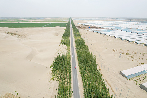 圖為在新疆和田地區和田縣拍攝的防護林帶,道路兩邊是沙漠飼草基地和設施農業基地(六月二十日攝,無人機照片)。(新華社記者丁磊 攝)