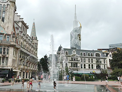 巴統位於格魯吉亞共和國西南部,黑海東岸,是格魯吉亞第二大城市,因有悠長的海岸線和一望無際的廣闊海洋,被譽為「黑海明珠」,往南15公里便是土耳其。我們車行三小時到達巴統,吃過午餐徒步遊覽巴統。歐洲廣是巴統最中心的地帶,廣場有一個大型地面噴水池,幾個小孩在那裡玩水,歡笑聲此起彼伏。環繞方形廣場是一些歐洲建築彙集之地,這裡有巴統最出名的劇場以及眾多的酒店,我們在這裡邊遊覽邊休息。