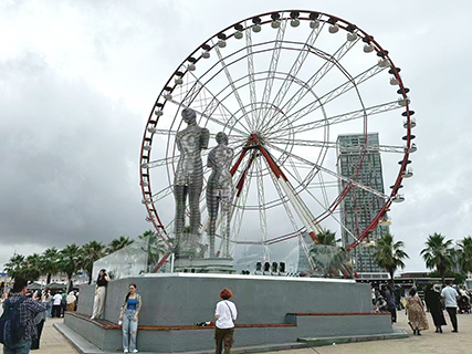 海邊有一座摩天輪,摩天輪旁就是巴統著名的阿里和尼諾(Aliand Nino)雕像。雕像位於巴統黑海步行街上,兩尊雕塑取材自1937年小說《Aliand Nino》。雕像講述的是兩個宗教信仰不同的男孩和女孩的悲情故事,彷彿格魯吉亞版的羅密歐與茱麗葉,或是梁山伯和祝英台,這樣愛而不得的愛情,讓人神傷。兩座雕像會自動分合,實際上就是兩座金屬支架合成的雕像。